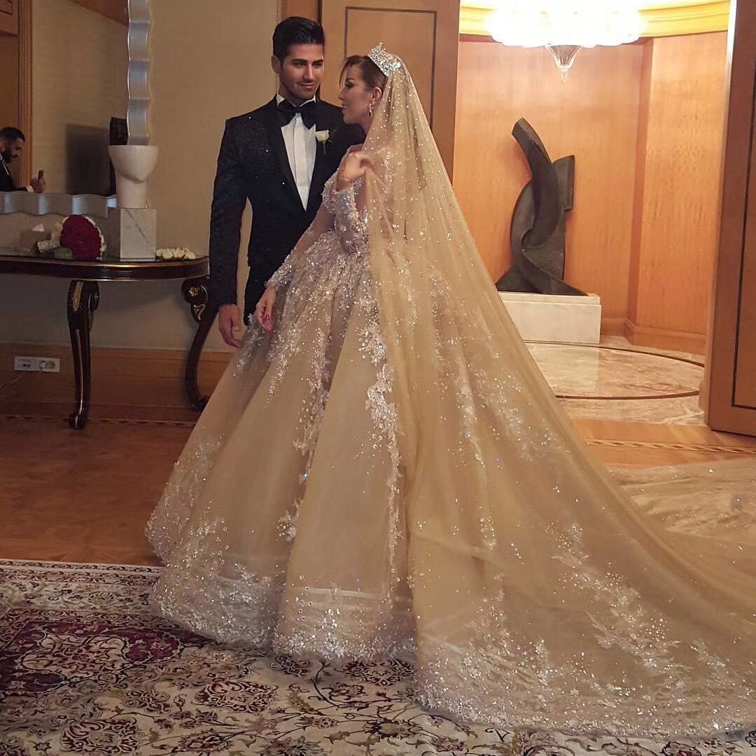 Acheter Dubai Dubai Pakistan Turquie Cristaux Fortement Brode Robe De Bal Robe De Mariee Champagne 2018 Manches Longues Bijou Decollete Chapelle Train De 3 340 71 Du Zhiyuanwedding Dhgate Com